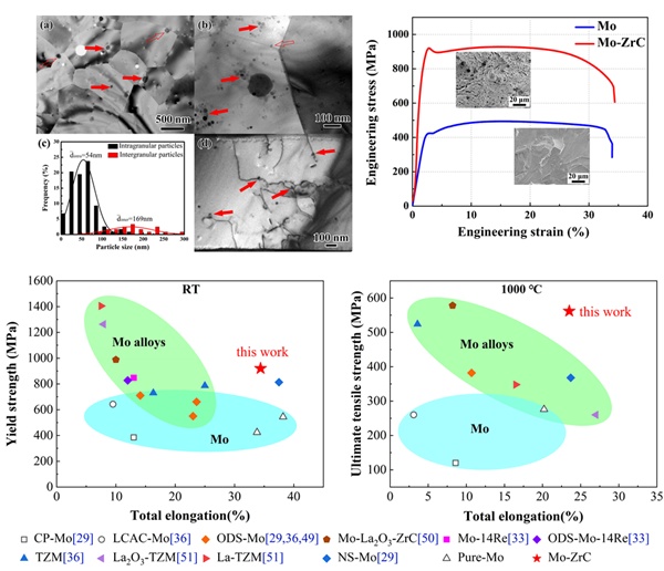 中国粉体网讯 近期,中科院合肥研究院固体所内耗与固体缺陷研究部与中国核动力研究设计院合作在高性能钼合金研究方面取得新进展,相关研究成果以“Excellent high-temperature strength and ductility of the ZrC nanoparticles dispersed molybdenum”为题发表在金属材料顶级期刊Acta Materialia(Acta Mater., 2022, DOI:10.1016/j.actamat.2022.117725)上。