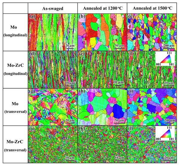 图2. 高温退火前后纳米结构Mo-ZrC合金和纯Mo的晶粒组织。