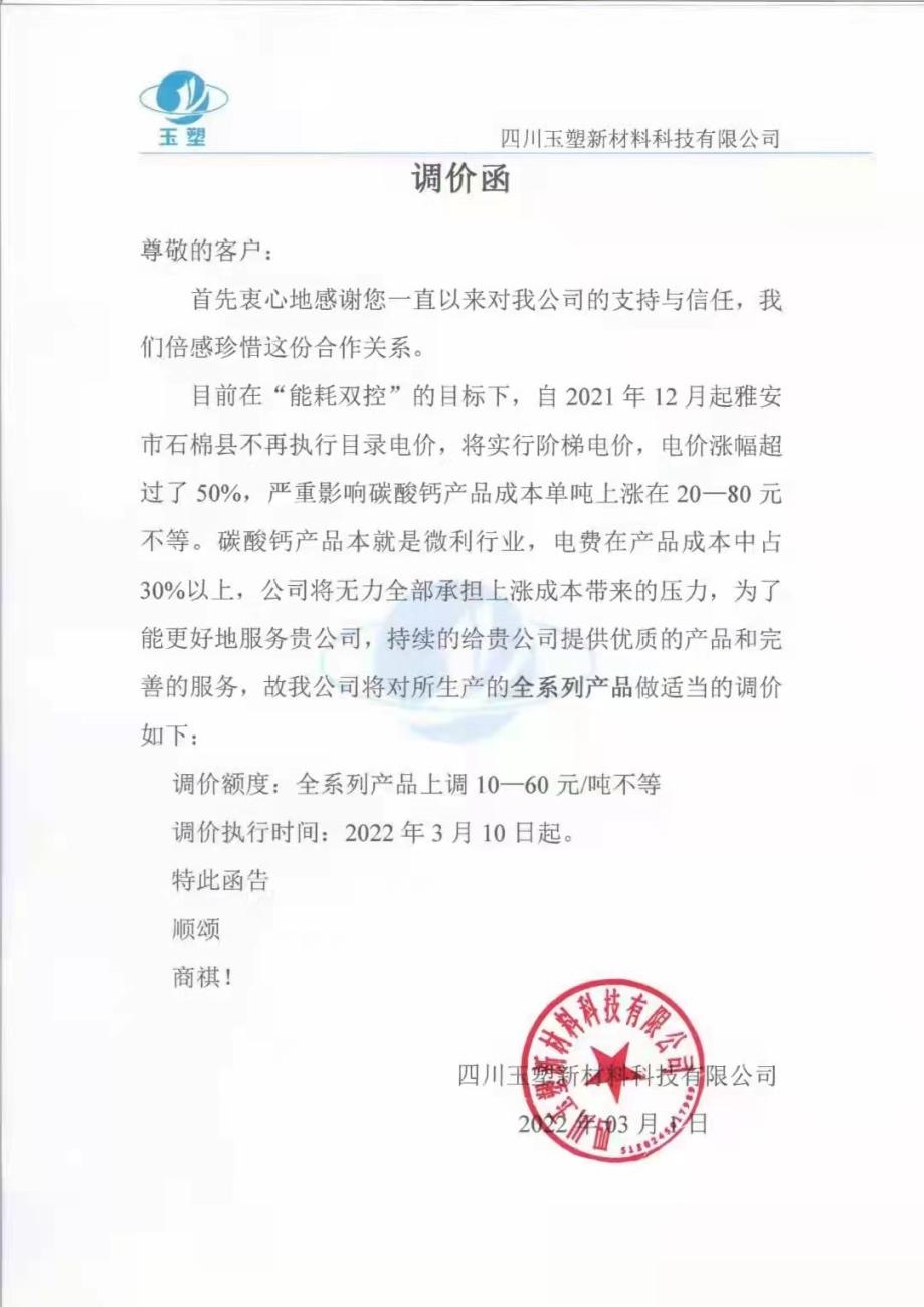 如四川玉塑新材料科技有限公司宣布3月10日起,全系列产品上调10-60元/吨不等。其表示目前在“能耗双控”的目标下,自2021年12月起雅安市石棉县不再执行目录电价,实行阶梯电价,电价涨幅超过了50%,严重影响碳酸钙产品成本单吨上涨在20-80元不等。碳酸钙产品本就是微利行业,电费在产品成本中占30%以上,公司将无力全部承担上涨成本带来的压力,为了能更好地服务贵公司,持续的给贵公司提供优质的产品和完善的服务,故公司将对所生产的全部系列产品做适当的调价。
