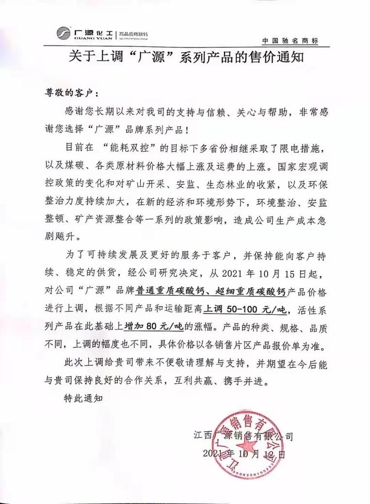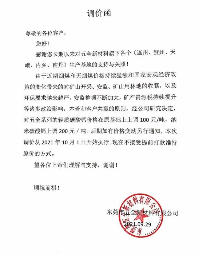 “能耗双控”政策调控下,拉闸限电、阶梯电价、限产停产等承压下,碳酸钙企业陆续发布调价函,宣布涨价。