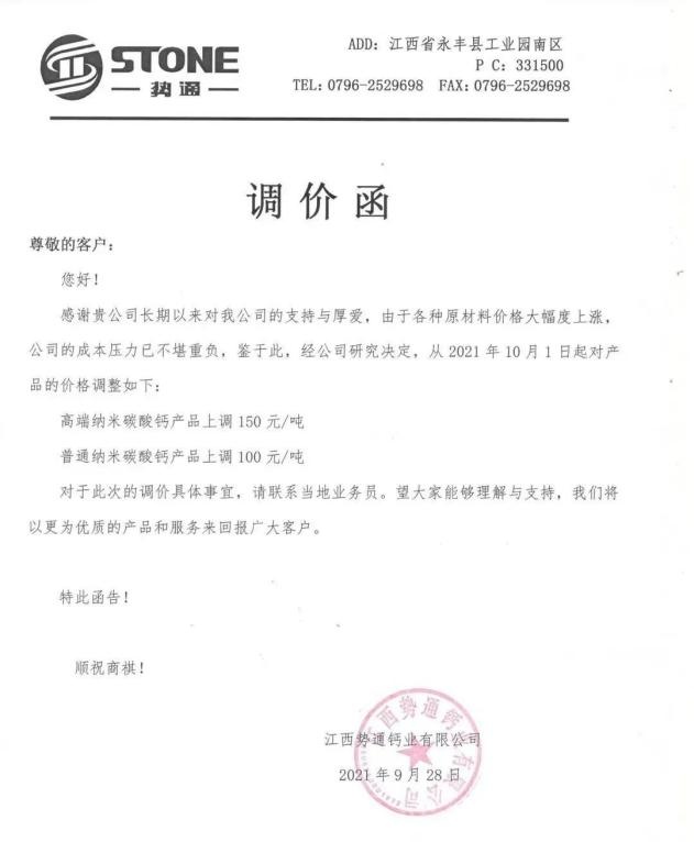 其实在刚过去不久的2021年,受煤炭石灰各类原材料大幅上涨以及运费成本提高等因素,江西广源化工有限责任公司、江西势通钙业有限公司、东莞市五全新材料有限公司、江西丰磊化工有限公司、广西平南县裕顺钙业公司、江西景盛碳酸钙有限公司、四川江油市都江钙品有限公司、湖南皕成科技股份有限公司、江西创先精细钙业有限公司等公司纷纷发布调价函,宣布涨价。