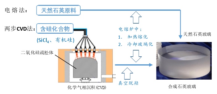 电熔法和两步CVD法制备石英玻璃锭的流程对比图