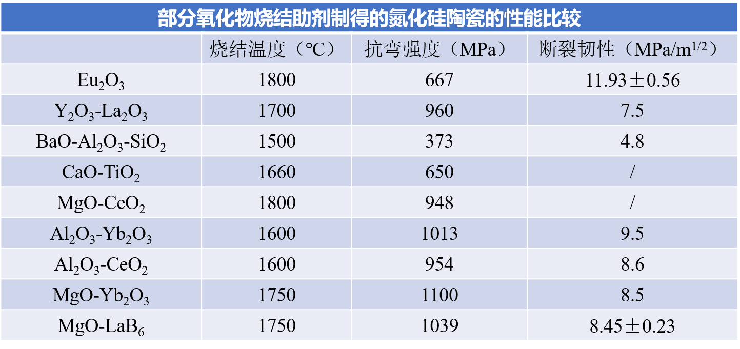 部分氧化物烧结助剂制得的氮化硅陶瓷的性能比较(数据来源:文科林等,《烧结助剂及增强相对氮化硅陶瓷材料性能的影响》)