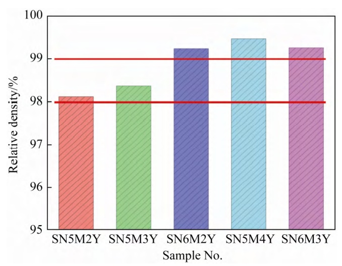 结果表明:当烧结助剂添加量为5%MgO+4%Y2O3时,样品相对密度最高达到99.47%,即Si3N4陶瓷均已实现致密化。