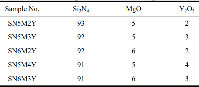 此外,烧结助剂的添加量对氮化硅的烧结密度也会产生一定影响。刘剑等以MgO、Y2O3为烧结助剂,按配方设计将Si3N4、MgO、Y2O3以一定摩尔比例混合(见下图),成形后将陶瓷素坯放置在氮化硼坩埚中进行气压烧结,烧结温度为1890℃,保温2h。整个烧结过程中使用氮气气氛保护,压力为2MPa。