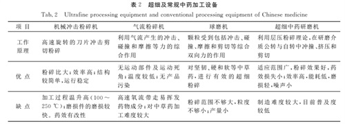 超细中药制备方法分为物理法和化学法两种,而超细粉碎工艺属于物理法。超细中药粉碎工艺是传统工业粉碎与中药特性相结合而形成的加工工艺[4],而传统的工业粉碎主要为三类:机械冲击粉碎法、气流粉碎法和球磨法。表2为超细中药加工设备同其他传统设备的对比。