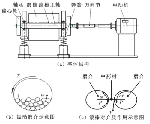 对待粉磨的物料即中药材原料,在外界旋转动力T及震力的作用下,研磨介质(简称磨介,即滚棒)做时而散开、时而聚合的上抛运动,滚棒自身做同向自转,速度为ω′,滚棒群做公转,速度为ω,通过内外层的滚棒不断交换位置,两两滚棒不断冲撞、挤压剪切中药材物料,使物料被挤破剪断。在破碎过程中大颗粒受力先被破碎,颗粒从大到小不断地被破碎。整个破碎过程在-10℃的低温环境中进行,使坚韧性中药材变成易粉碎的湿脆体,提高了粉碎效率,且低温条件下的这种粉磨方式可有效防止加工过程成分挥发或氧化,保证药性不受损失。设备结构及原理简图如图3所示。P为挤压力,τ为剪切力。