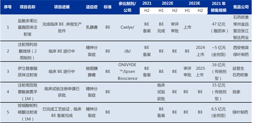 目前公司已有1个产品完成了BE试验;4个产品进入临床BE阶段(包括已完成备案但暂未开展试验的产品)。其中进度最快的盐酸多柔比星脂质体注射液已递交了上市申请,注射用利培酮微球和伊立替康脂质体注射液均处于BE阶段,均有望于2023~2024年陆续完成。注射用双羟萘酸奥氮平和棕榈酸帕利哌酮注射液于2022年相继获批临床BE,但目前还未开展。目前公司在研管线中有8个产品进度靠前,预计有望于2023年开始陆续将产品推向市场,公司即将进入业绩的收获期。