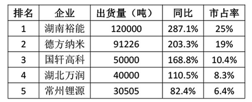 电池中国网:中国市场磷酸铁锂材料出货量TOP 5