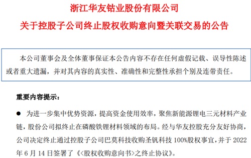 中国粉体网讯 为进一步集中优势资源,聚焦新能源锂电三元材料产业链,加快上游镍、钴、锂资源布局和下游产品开发、产能扩建,浙江华友钴业股份有限公司拟终止在磷酸铁锂材料领域的布局。经与华友控股充分友好协商,华友钴业决定终止通过控股子公司巴莫科技收购圣钒科技100%股权事宜,并于2022年6月14日签署了《<股权收购意向书>之终止协议》。