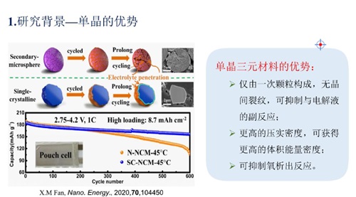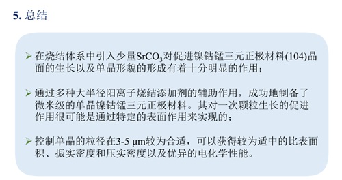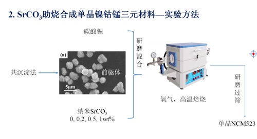 为了追求更高的性能,高镍三元正极材料的Ni含量不断增加,但是随之而来的问题随之加剧。为了改善材料的性能,来自中南大学的杜柯教授首先跟我们分享了单晶镍钴锰三元材料的制备及改性研究。单晶化是针对高镍三元材料二次颗粒易破碎、粉化,易与电解液发生反应而提出的改性策略。但是常用单晶制备方法:高温烧结法和熔盐辅助法都无法避免水洗+二次烧结处理,增大了成本。为此,杜教授实验室利用碳酸锶助烧合成单晶镍钴锰三元材料,并详细分析了用此方法制备的三元材料的结构、形貌、电化学性能等不同实验指标,以及不同助烧剂对材料制备的影响,证实在烧结体系中引入碳酸锶对促进镍钴锰三元正极材料晶面的生长及单晶形貌的形成有十分明显的作用。