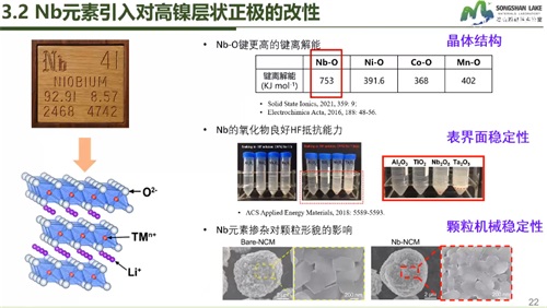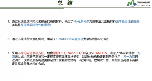 热稳定性不佳,高温环境条件下电化学性能衰退明显,是高镍三元材料面临的难题之一。哈工大(威海)松山湖材料实验室的朱永明教授从体相掺杂方面入手,跟我们分享了铌掺杂制备高稳定高镍三元材料的研究。掺杂可以从微观上稳定材料结构,改善电化学性能,且操作难度小,改性效果明显,是较易实现的改性方法。实验证明1mol%的铌掺杂为最佳的掺杂方案,铌元素掺杂可以提高高镍三元正极材料的循环稳定性。铌元素对多晶高镍正极出色的改性效果,为多晶材料的发展提供了可能。