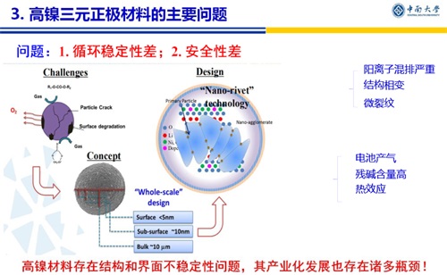 三元正极材料自从1999年被报道以来,其种类和性能都得到了快速发展!尤其高镍三元材料优势显著,受到了极大关注和广泛研究。中南大学的唐有根教授分别从三元材料的发展、高镍三元正极材料面临的主要问题、高镍三元材料的改性研究、以及围绕高镍三元材料所做的一系列工作,展现了高镍三元材料的研究热点,指明了高镍三元正极材料是高能量密度锂离子动力电池的发展方向。