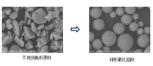 氧化铝用作原料时,一般不需要经过化学反应仅需要物理变化就可以获得球形氧化铝颗粒。其本质是在短时间内利用高温实现相变,同时利用表面张力的作用使颗粒球化。当使用无规则氧化铝作为原料时,产物具有产率高、形貌规则和低污染的优点。能获得具有低团聚和高分散性能的球形粉末,但是其装置要求高、设备价格高、能耗高。