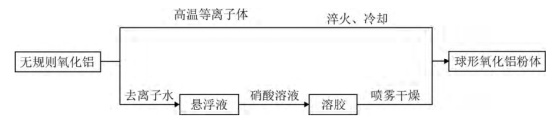 无规则氧化铝泛指颗粒形貌不规则的氧化铝,既包括无水氧化铝也包括水合氧化铝,以无规则氧化铝为原料时常采用等离子体法和喷雾干燥法。常用的等离子体法主要有两种:直流电弧等离子体法和射频等离子法体法。其中,直流电弧等离子体法具有高球化率和高产率的优点,但通过高温将反应物等离子化时,电极易熔化,产物易被污染,纯度达不到要求。射频等离子体法不具有电极,产物纯度较高,但有着能耗大的缺点。