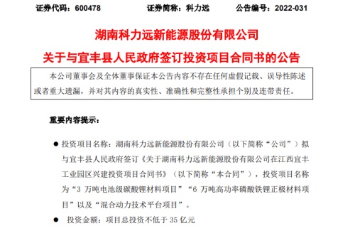 6月24日晚间,科力远公告称,公司与宜丰县人民政府签订合同,拟在宜丰县人民政府工业园区布局投资3万吨电池级碳酸锂材料和6万吨高功率磷酸铁锂正极材料项目,总投资不低于25亿元;另外投资混合动力技术平台项目,将把204项国内专利、18项国际专利转至公司在宜丰县关联公司江西鼎盛新材料科技有限公司名下,专利技术评估价值不低于10亿元。
