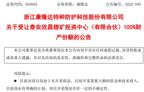 6月24日,康隆达发布《关于受让泰安欣昌锂矿投资中心(有限合伙)100%财产份额的公告》,公司拟以自有或自筹资金人民币9,500万元受让胡艳霞、海南恒琦供应链管理有限公司合计持有的泰安欣昌100%财产份额。