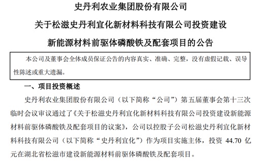 中国粉体网讯 6月29日晚间,史丹利公告,拟以控股子公司松滋史丹利宜化新材料科技有限公司(下称“史丹利宜化”)作为项目实施主体,投资44.7亿元在湖北省松滋市建设新能源材料前驱体磷酸铁及配套项目。