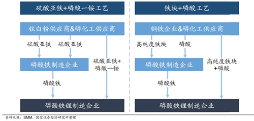 目前工业化生产磷酸铁的方式主要有两种:(1)使用净化磷酸(可热法或湿法)与高纯度铁块反应制备磷酸铁;(2)使用磷酸盐与硫酸亚铁反应制备磷酸铁,常用磷酸盐主要为磷酸一铵(磷酸二氢铵)和磷酸二铵(磷酸氢二铵),主流磷酸盐为磷酸一铵。归类为“铁块+磷酸”、“硫酸亚铁+磷酸一铵”工艺。