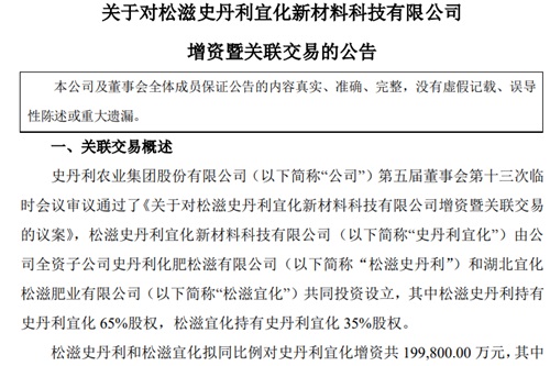6月29日晚间,史丹利还发布了一则公告,松滋史丹利和松滋宜化拟同比例对史丹利宜化增资共19.98亿元。公司表示,本次增资有利于实现公司磷化工产业链布局发展战略的落地,增资完成后双方将全力推进项目建设。
