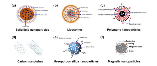 代表性抗肿瘤药物输送纳米载体:固体脂质纳米颗粒(a)、脂质体结构(b)、聚合物纳米颗粒(c)、碳纳米管(d)、介孔硅纳米颗粒(e)和磁性纳米颗粒(f)