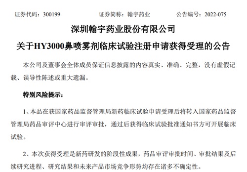 中国粉体网讯 8月4日晚,翰宇药业发布公告称,公司收到国家药品监督管理局签发的《受理通知书》,公司HY3000鼻喷雾剂临床试验注册申请获得受理。