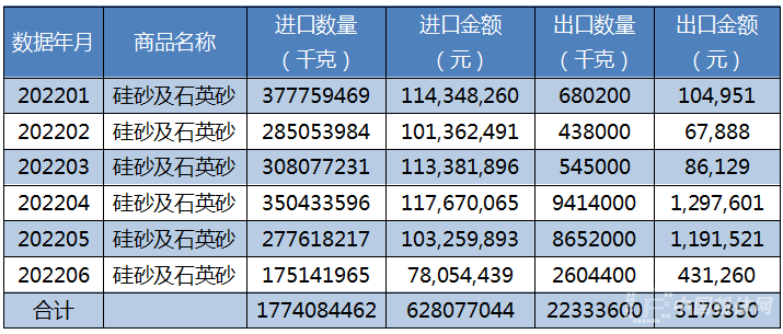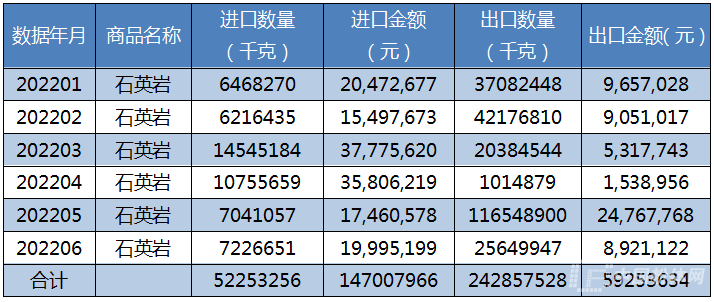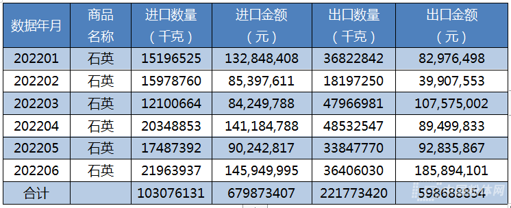 海关数据显示,2022年上半年,我国石英进口约计10.3万吨,石英出口22.17万吨。