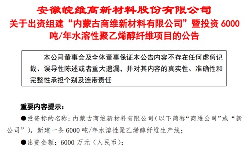 本着生产线高效化、集约化原则,公司决定组建“内蒙古商维新材料有限公司”,独立经营6000吨/年水溶性聚乙烯醇纤维项目。内蒙古商维新材料有限公司是一家新成立的有限公司,由皖维集团下属皖维高新材料股份有限公司(“皖维高新”)全资投资人民币6000万元,公司注册在内蒙古乌兰察布市商都县。公司成立的目的为依托蒙维科技的原材料PVA,采用皖维高新先进成熟技术生产水溶性聚乙烯醇纤维,一期生产规模6000吨/年。