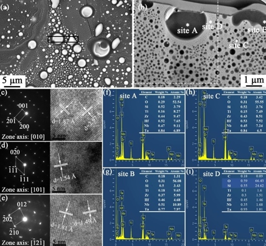 烧蚀表面片状(Hf0.5Zr0.5O2)’和 (TiNbTaO7-y)’ 纳米晶形成的“三明治”结构:微观形貌(a、d)、晶体结构解析(b、e)及元素组成分析(c、f)
