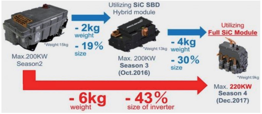 SiC材料载流子迁移率高,能提供较高的电流密度,相同功率等级下封装尺寸更小。SiC能够实现高频开关,减少滤波器和无源器件如变压器、电容、电感等的使用,从而减少系统体系和重量;SiC禁带宽度宽且具有良好的热导率,可以使器件工作于较高的环境温度中,从而减少散热器体积;SiC可以降低开关与导通损耗,使系统效率提升,同样续航范围内,可以减少电池容量,有助于车辆轻量化。