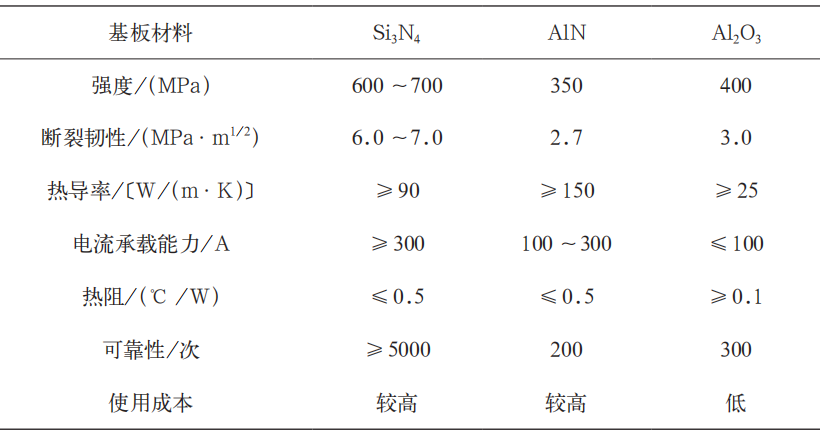 三种陶瓷基板材料性能对比(来源:张伟儒,《第3代半导体碳化硅功率器件用高导热氮化硅陶瓷基板最新进展》)