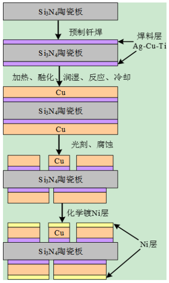 以后者为例,工艺流程如下图所示。首先将Ag、Cu、Ti元素直接以粉末形式混合制成浆料,采用丝网印刷技术将Ag-Cu-Ti焊料印刷在氮化硅陶瓷基板上,再利用热压技术将铜箔层压在焊料上,最后通过烧结、光刻、腐蚀及镀Ni工艺制备出符合要求的氮化硅AMB覆铜板。