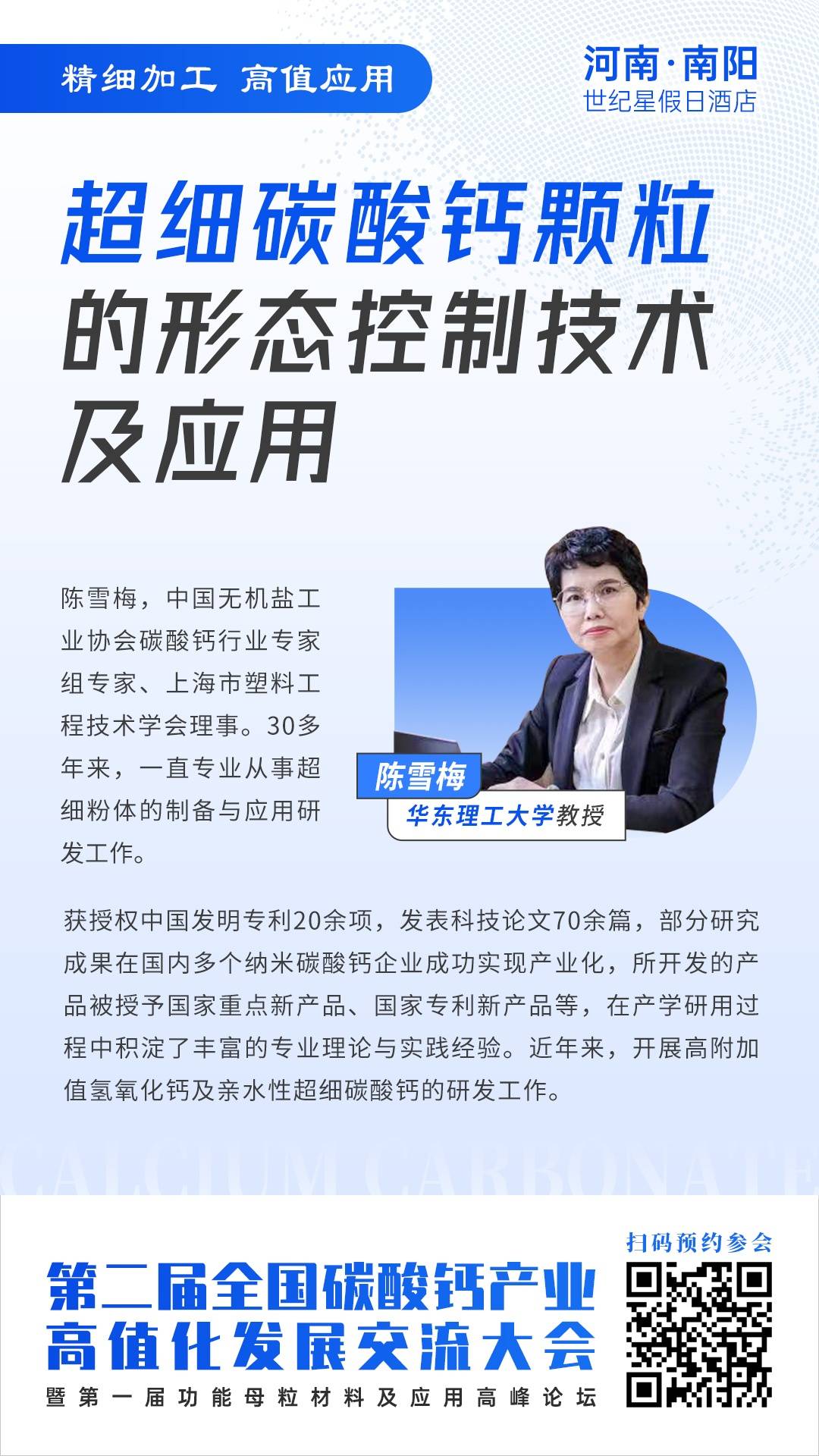 3月16~17日,第二届全国碳酸钙产业高值化发展交流大会将在河南·南阳举行,届时中国无机盐工业协会碳酸钙行业专家组专家、上海市塑料工程技术学会理事、华东理工大学陈雪梅教授将在大会上做“超细碳酸钙颗粒的形态控制技术及应用”的学术报告,全面深入的阐述主题内容,与参会人员开展深入交流,解答技术难题,心动就要行动,现在就可了解。