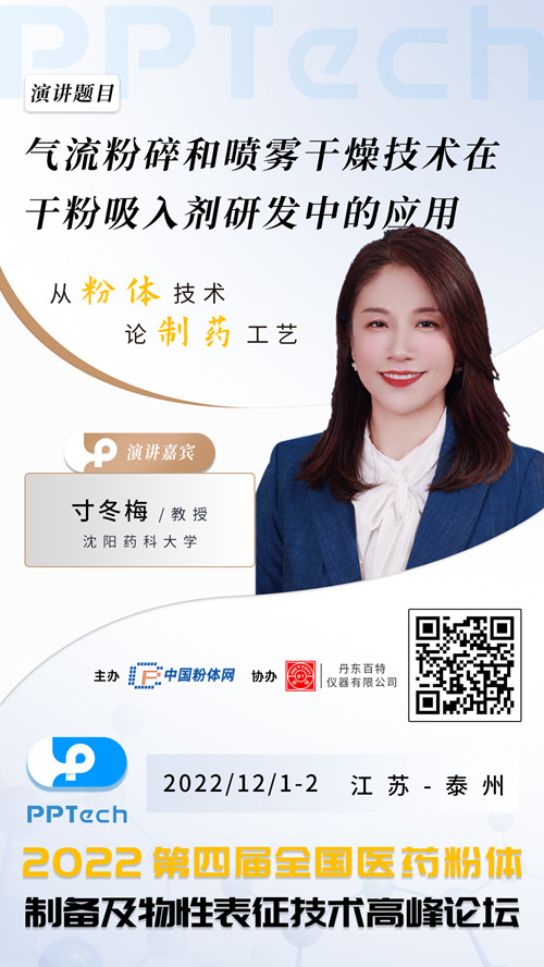 干粉吸入剂的制备离不开医药粉体制备技术的应用。2022年12月1-2日,中国粉体网将在江苏泰州碧桂园凤凰酒店举办“第四届全国医药粉体制备及物性表征技术高峰论坛”,届时将邀请来自沈阳药科大学的寸冬梅教授作《气流粉碎和喷雾干燥技术在干粉吸入剂研发中的应用》报告,报告人从自己的研究领域出发,详细介绍气流粉碎和喷雾冷冻干燥技术在干粉吸入剂中的应用。