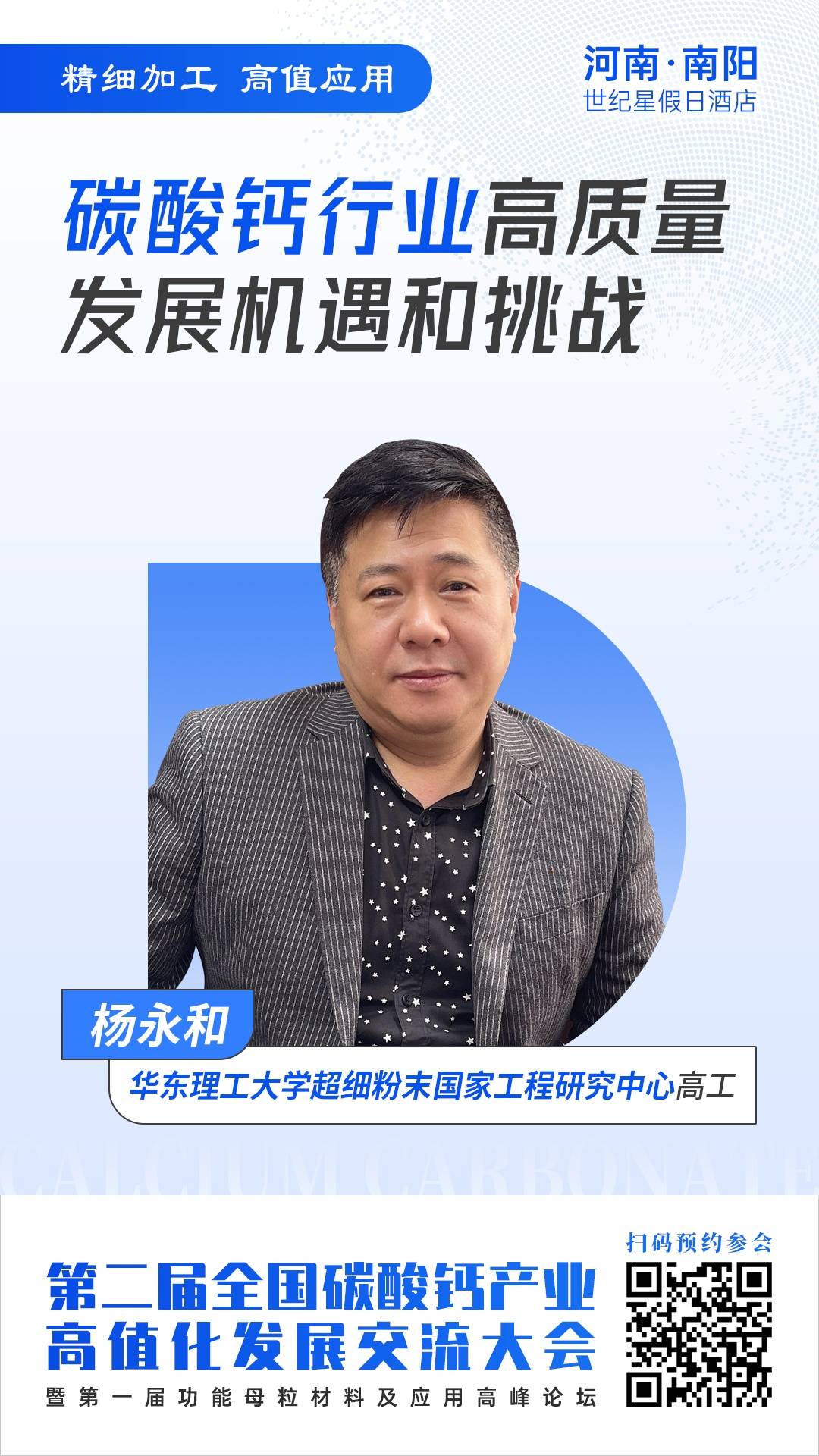 3月16~17日,第二届全国碳酸钙产业高值化发展交流大会将在河南·南阳举行,届时华东理工大学超细粉末国家工程研究中心副总工程师杨永和将在大会上做“碳酸钙行业高质量发展机遇和挑战”专题报告,全面分析碳酸钙行业发展现状,以高附加值产品生产及先进加工设备应用为案例,给企业提供可参考的解决方案,一对一解答参会人员疑问。