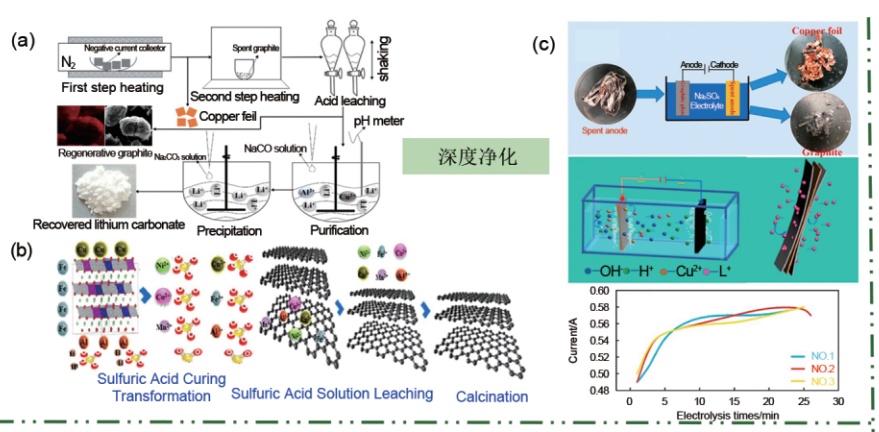 石墨回收方法:(a)无机酸回收;(b)硫酸固化法;(c)电化学法(来源:燕乔一等,《锂离子电池负极石墨回收处理及资源循环》)