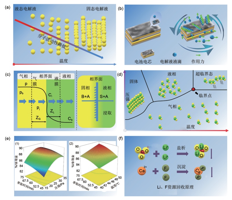 不同电解液回收的机理示意图:(a)冷冻法;(b)机械离心法;(c)有机溶剂萃取法;(d)、(e)超临界二氧化碳萃取法;(f)锂盐回收方法(来源:张群斌等,《废旧电池电解液回收及高值化利用研发进展》)