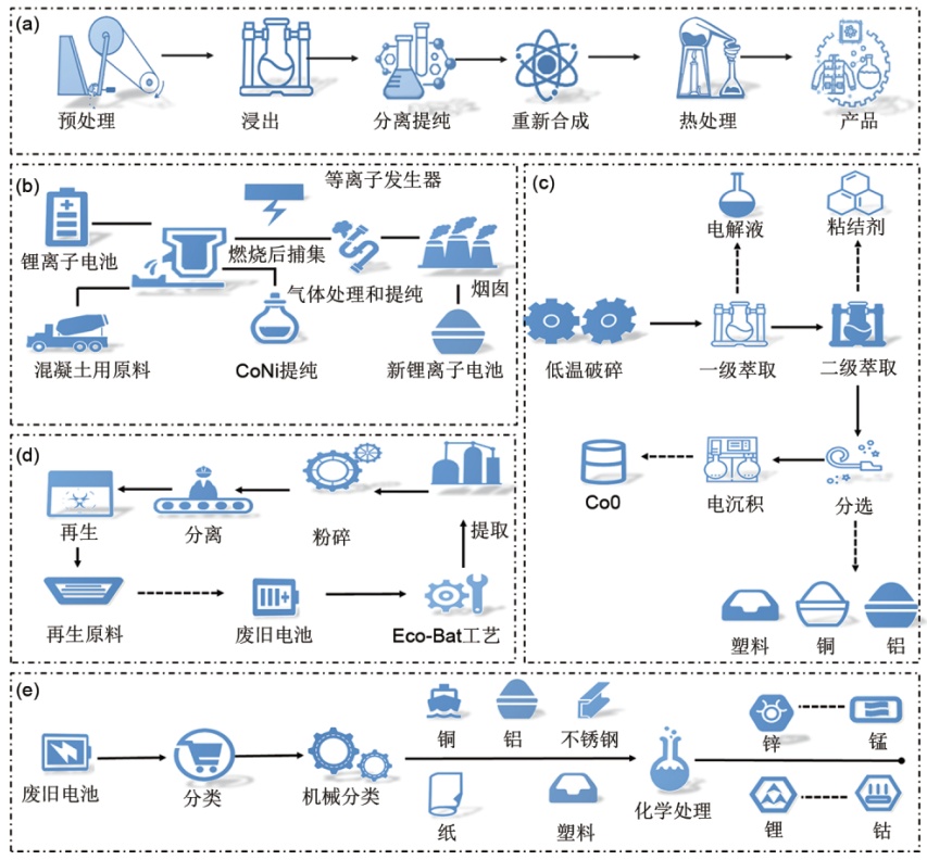 国内外企业回收锂电池电解液案例:(a)格林美工艺;(b)比利时Umicore工艺;(c)英国AEA工艺;(d)日本OnTo工艺;(e)法国Recupyl工艺(来源:张群斌等,《废旧电池电解液回收及高值化利用研发进展》)