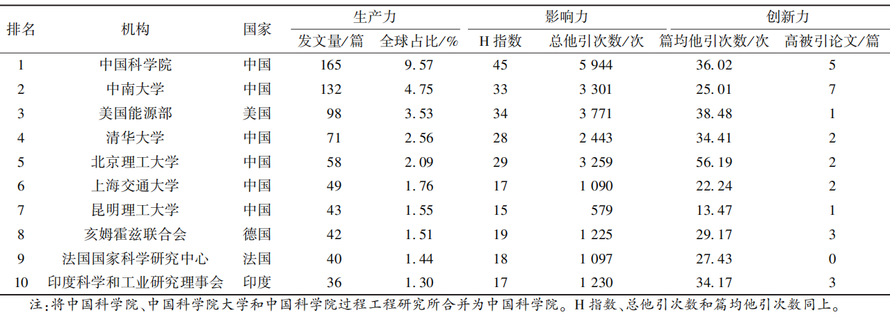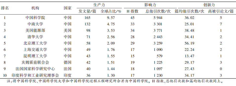 影响力方面,以H指数、总他引次数和篇均他引次数为衡量指标,结果显示:中国科学院、中南大学和美国能源部居H指数和总他引次数的前三位;北京理工大学、中国科学院和美国能源部位列篇均他引次数前三位。