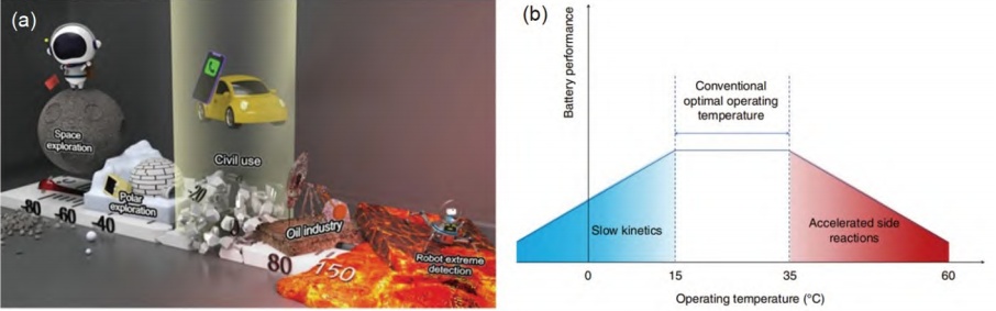 (a)锂电池面临的不同温度的应用场景示意图;(b)极端工作温度对于电池带来的影响(来源:戚世翰等,宽温域锂电池电解液研究进展)