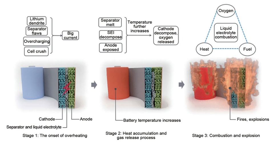 锂电池热失控过程的三个阶段(来源:欧宇等,锂离子电池中的智能安全电解液研究进展)