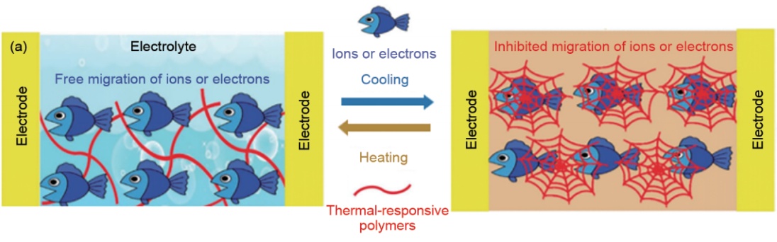 通过可逆的热响应聚合物来抑制电极之间的离子或电子传导以防止电化学存储设备的热失控(来源:欧宇等,锂离子电池中的智能安全电解液研究进展)