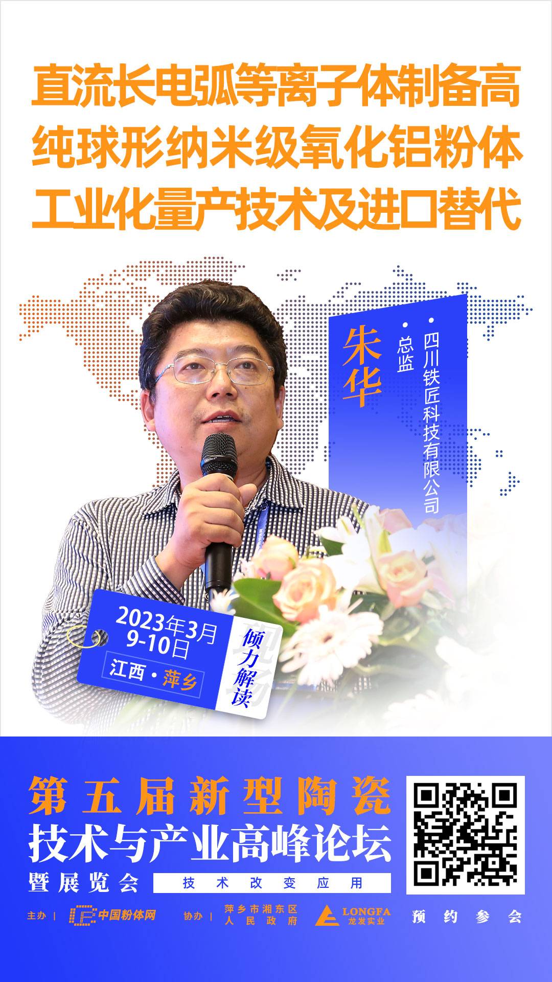 2023年3月9-10日,中国粉体网将在江西萍乡举办“2022第五届新型陶瓷技术与产业高峰论坛”。为了更全面的让大家了解等离子体法制备球形氧化铝粉体技术及实际应用,我们邀请到了一位技术大咖前来讲解——四川铁匠科技有限公司朱华总监作题为《直流长电弧高温热等离子体束批量制备高纯球形纳米级氧化铝粉体技术及应用》的报告。