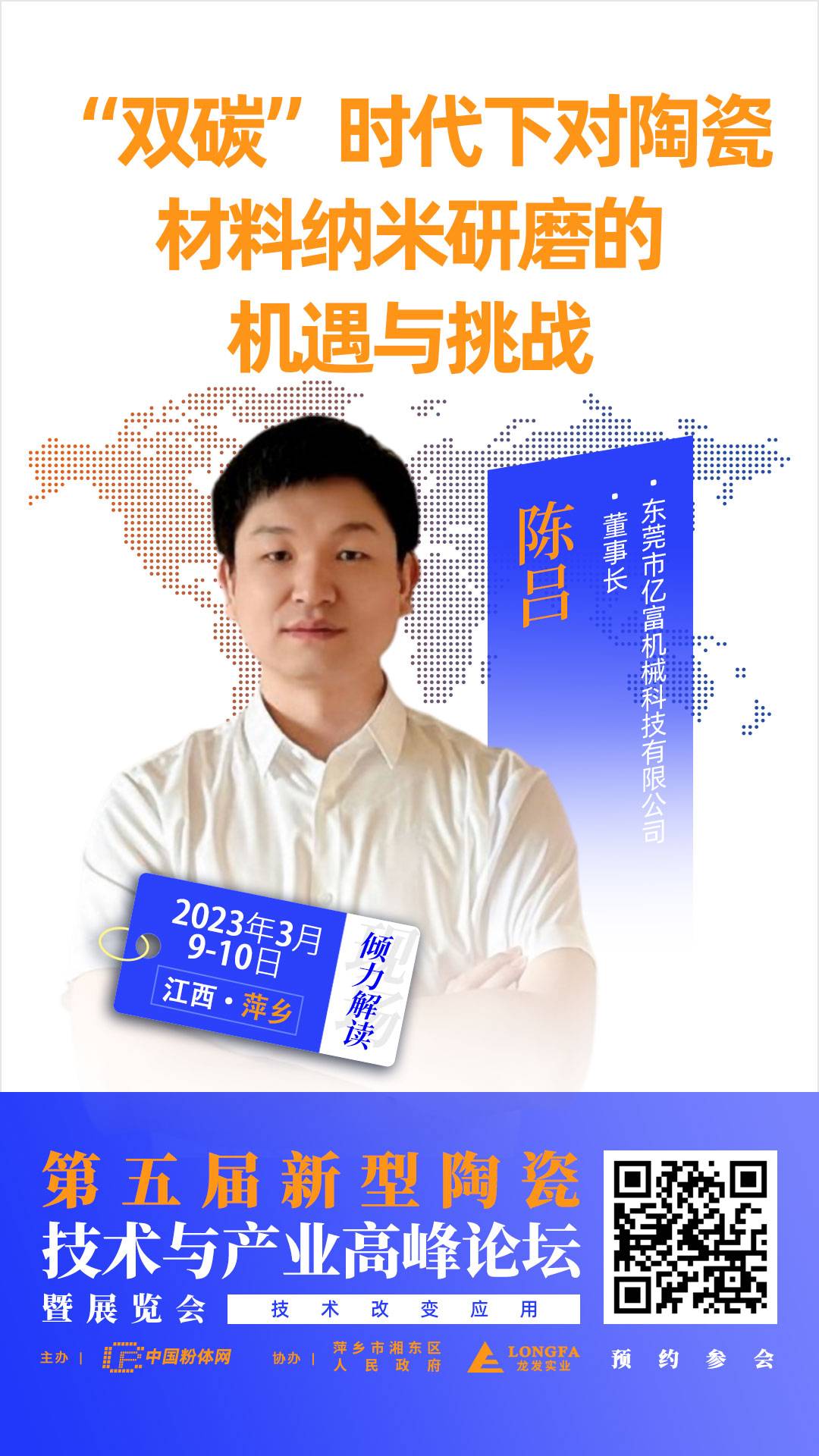 2023年3月9-10日,中国粉体网将在江西萍乡举办“2022第五届新型陶瓷技术与产业高峰论坛”,我们邀请到东莞市亿富机械科技有限公司总经理陈吕先生作题为《双碳时代下对陶瓷材料纳米研磨的机遇与挑战》的报告。届时,陈总将对纳米砂磨机在先进陶瓷制备中的实际应用情况进行介绍,以期给予纳米陶瓷厂家一些设备选择方面的参考。