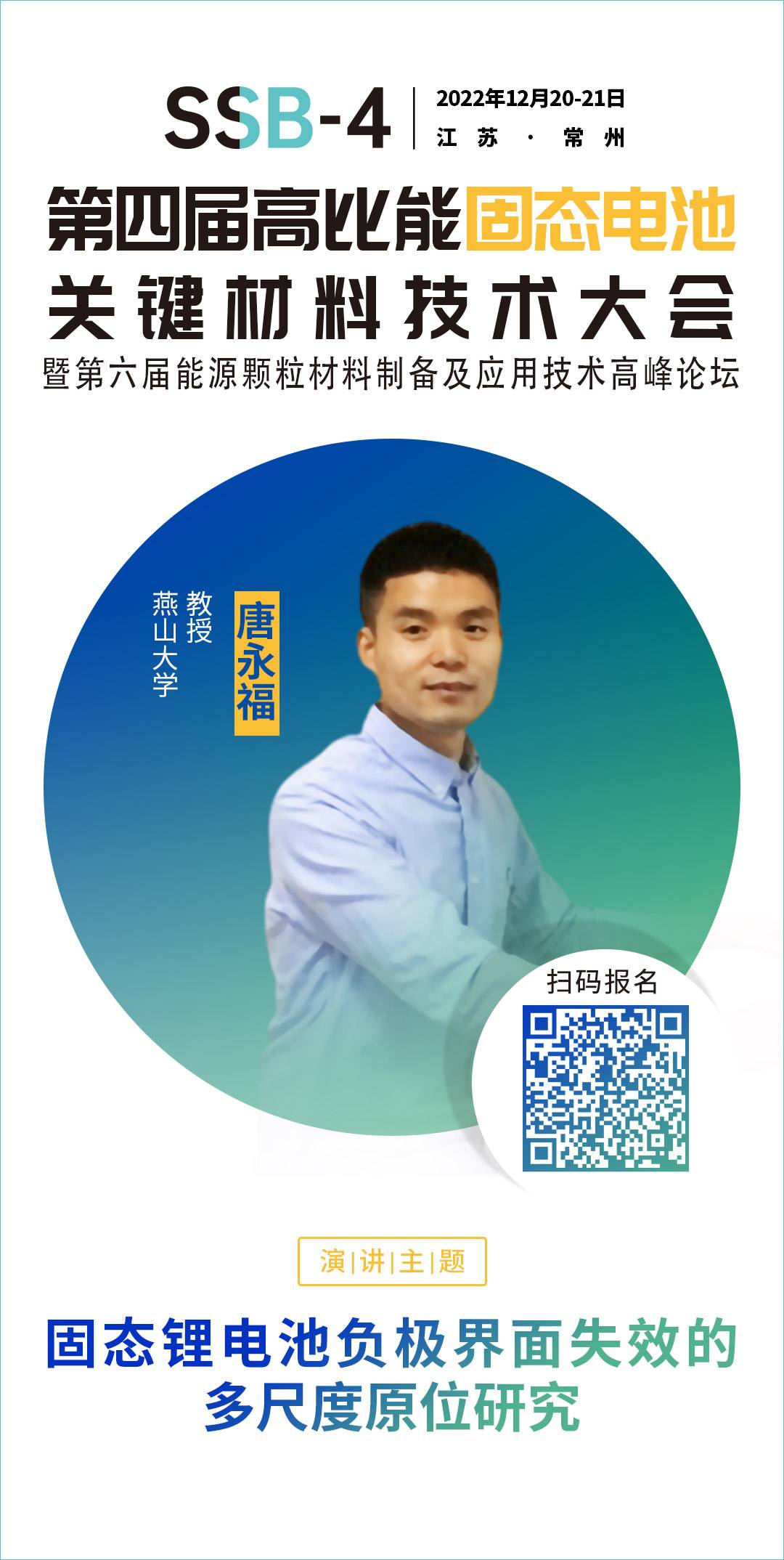 针对固态电池相关的技术、材料、市场及产业等方面的问题,中国粉体网将于12月20-21日在常州举办第四届高比能固态电池关键材料技术大会,为致力于固态电池技术开发的企业,科研院校,以及电动车、储能、特种应用等终端企业提供信息交流的平台,开展产、学、研合作,共同推动行业发展。届时,燕山大学唐永福教授将作题为《固态锂电池负极界面失效的多尺度原位研究》的报告。报告将介绍近年来通过原位透射电镜、原位扫描电镜等多尺度可视化手段对锂枝晶及负极界面失效力-电-化学耦合特性的原位研究,直观解析不同固态电池体系锂枝晶的形成及演化机制,提出锂枝晶抑制的可能策略,为长寿命、高安全固态锂电池的设计与开发提供参考。