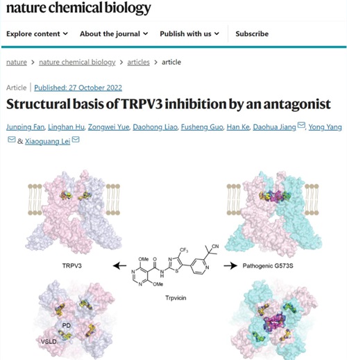中国粉体网讯 10月27日,北大-清华生命科学联合中心雷晓光课题组与中国医学科学院皮肤病医院杨勇教授和中科院物理所姜道华研究员课题组合作,在Nature Chemical Biology期刊发表了题为:Structural basis of TRPV3 inhibition by an antagonist的研究论文。该研究揭示了靶向TRPV3离子通道蛋白小分子抑制剂的作用机制,并证实它具有治疗多种皮肤疾病的潜能。