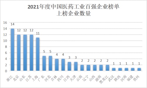 12月18日下午,在2022(第39届)全国医药工业信息年会上,“2021年度中国医药工业百强榜”发布。据榜单所示,浙江省上榜企业最多,有14家;北京、山东、江苏紧随其后,有12家;上海有11家。5省医药工业百强企业占总数61%。