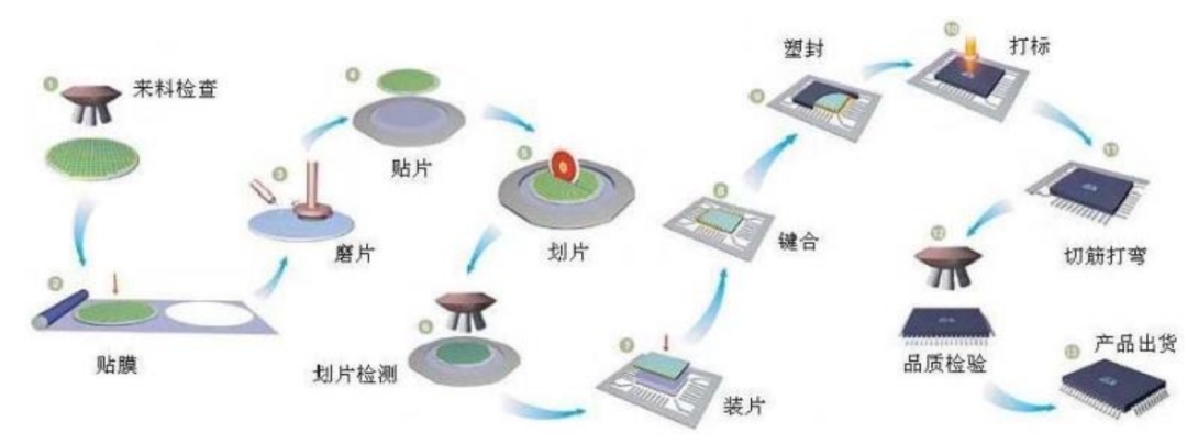 芯片封装工艺流程包括来料检查、贴膜、磨片、贴片、划片、划片检测、装片、键合、塑封、打标、切筋打弯、品质检验,最终是产品出货。在这一过程中,就需要用到封装基板、引线框架、键合丝、包封材料、陶瓷基板、粘接材料等封装材料。