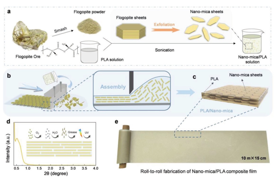 中国科学技术大学俞书宏院士、管庆方特任副研究员团队通过引入最有效的仿生模型之一的“砖和泥”结构来改善材料的综合性能。提出了PLA辅助的剥离和分散方法,以天然矿物云母为原料制备PLA包覆的云母纳米片(纳米云母/PLA)。通过引入剪切力组件,可以制造出一种具有“砖和泥”结构的珍珠质纳米复合薄膜。这种珍珠质纳米复合膜显示出优异的机械性能、紫外线屏蔽和阻气性能。珍珠质纳米复合薄膜的整体性能优于商业塑料薄膜,这将有可能打开PLA在包装领域实际应用的道路。这项研究以“Nacre-Inspired Nanocomposite Films with Enhanced Mechanical and Barrier Properties by Self-Assembly of Poly(Lactic Acid)Coated Mica Nanosheets”为题发表在著名期刊Advanced Functional Materials。