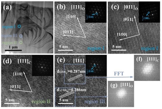 Sr(Zr0.95Ti0.05)O3陶瓷的(a)TEM明场像,(b)、(c)、(d)和(e)对应的高分辨像,(f)和(g)傅立叶变换图像